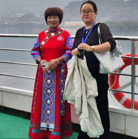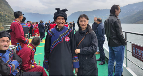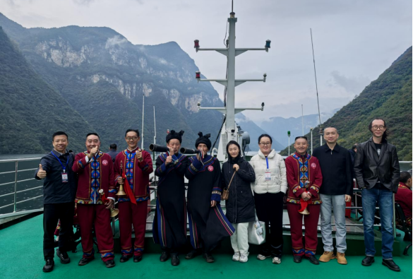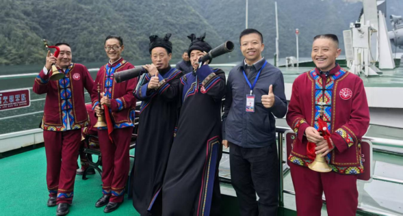 10月30日上午,我院教师随同专家学者们乘船沿清江开启廪君文化探源之旅。船行碧波上,土家族民间艺人吹起气韵绵长的土家号角,唱起婉转悠扬的五句子山歌、质朴奔放的山民歌交替奏响,饱含鲜活的巴风土韵。专家学者们纷纷拿出手机记录精彩瞬间,我院三位老师也被刚健粗犷的土家族文化所吸引,对土家族男女服装款式及服饰上的西南卡普图案、色彩搭配、头部青丝包帕、吹奏乐器等典型的土家族文化符号,以及土家族哭嫁歌内容进行了仔细观察和系统收集,并与歌手们探讨了歌声里蕴含的文化内涵和情感寄托。