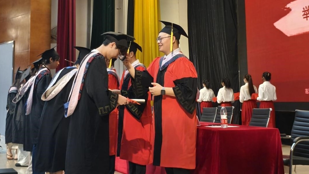 随后进行授位仪式。主席台就座的领导、老师为2025届毕业生逐一颁发学位证书,并拨穗正冠。