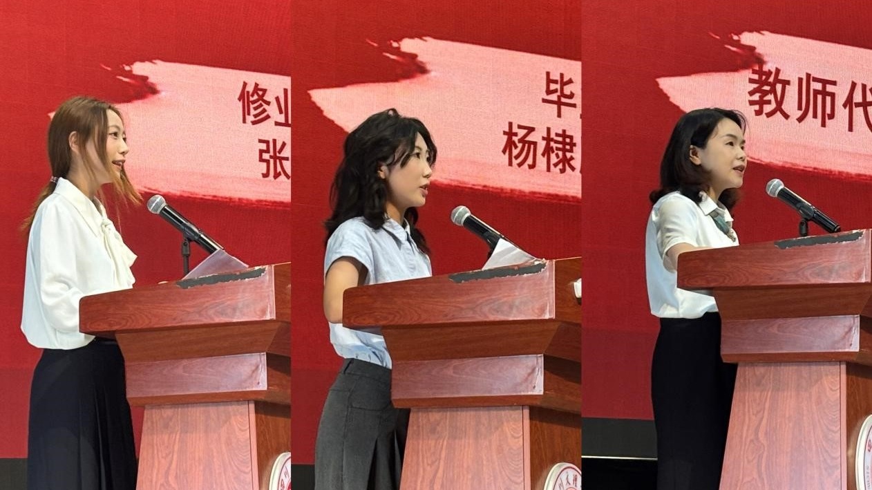 修业班学生代表张睿表达了对学长学姐的感激、祝福与不舍。毕业生代表杨棣麟回顾了四年求学时光,对默默付出、辛勤工作的领导老师们表达了深深的感谢,表示将牢记母校的培养。教师代表黄莎博士勉励即将踏出大学校园的同学们坚守艺术初心,在人生的每一个阶段都能找到属于自己的色彩。