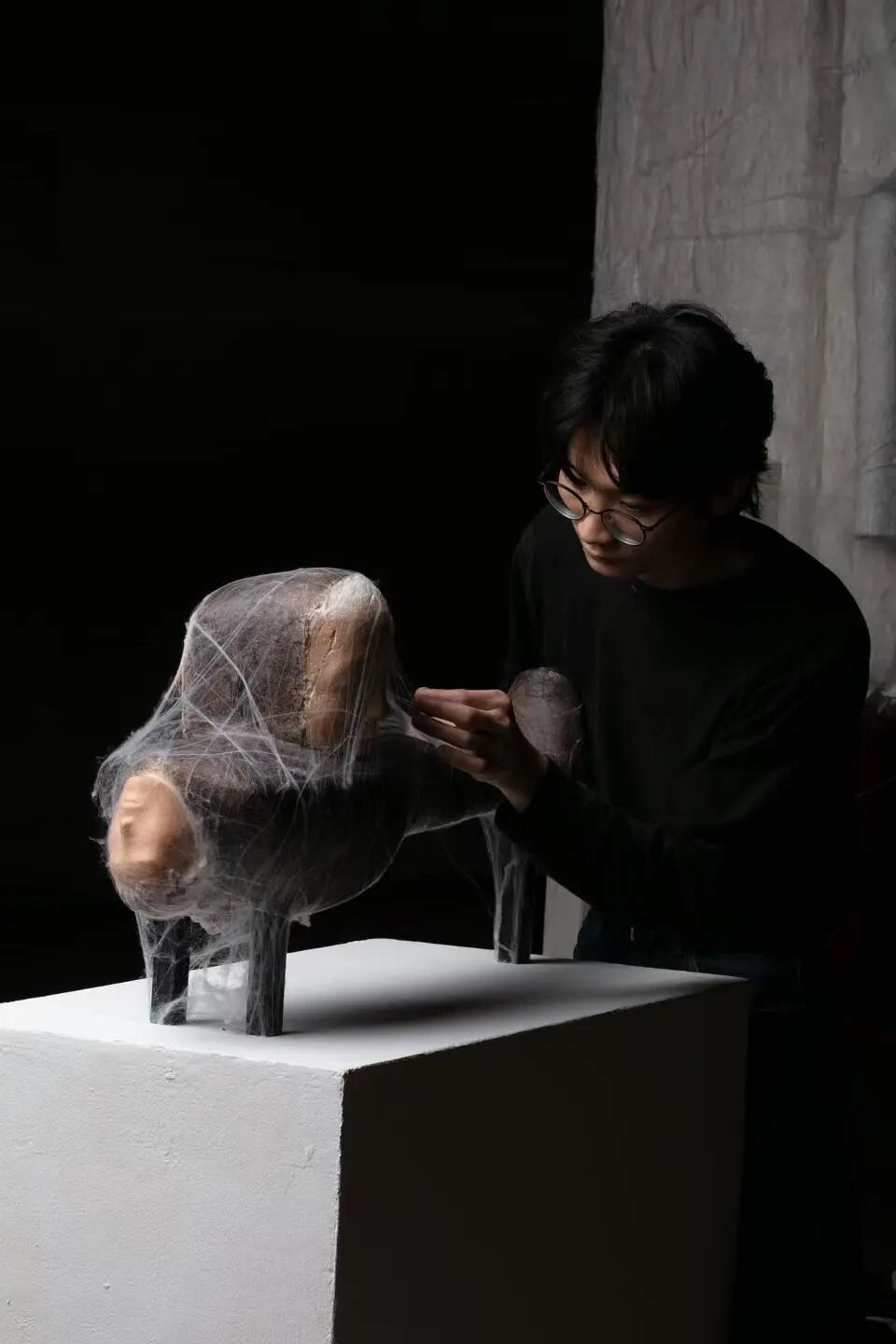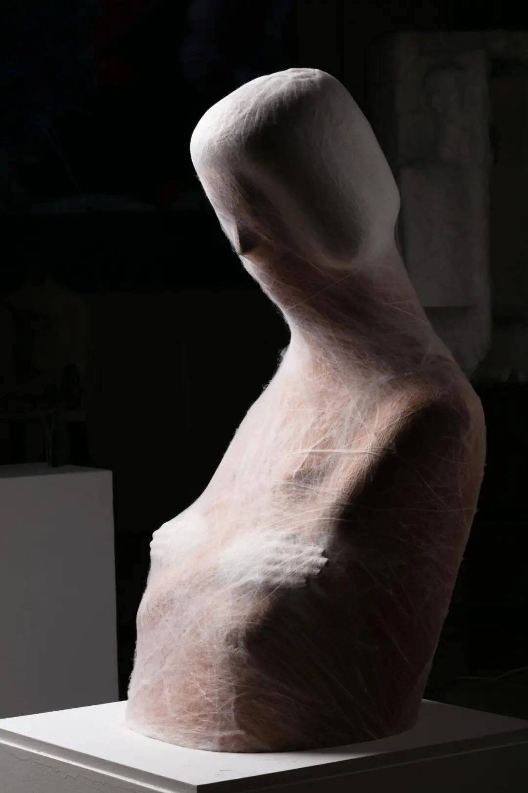 作品《思》创作于2023年,以陶土与蚕丝为材,体量宏大。其创作核心在于多维视角下的自我审视与精神内观,致力于探索个体与自我内心困境的和解路径,完成了一场从物质塑造到精神对话的深度创作实践。
